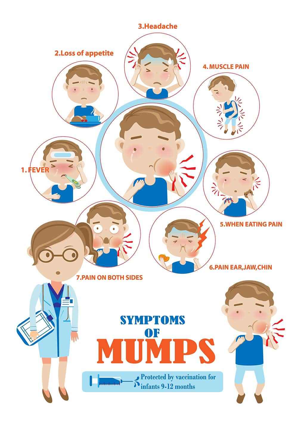 Mumps is a viral infection of the parotid gland produced by paramyxovirus. Major symptoms are fever, headache, muscle ache, and general fatigue, but the classical signs are painful mandibular swelling near the jaw and just below the ear. Minor symptoms or complications of the disease are orchitis, oophoritis, meningitis, encephalitis, dysphagia and difficulty to chew food. Symptoms start appearing within 1-2 weeks of the infection. Mumps and its complication are more common in children of age 5-14-years. Unimmunized children with decreased immunity can develop severe complications like orchitis and meningitis. MMR vaccine is typically used to prevent this infection and its severe complications. If you suspect mumps infection or any of its warning signs or complications, it is critical to seek proper advice from your doctor.