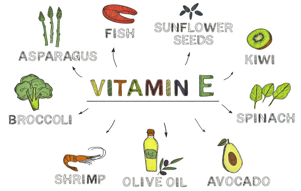 • Vitamin E is a fat-soluble vitamin which can be found in fat-rich food such as sunflower seeds, almonds, avocados, olive oil, salmon, shrimp, hazelnuts and coconut oil.